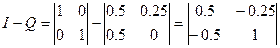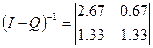 Как указывалось выше, из поглощающего состояния нельзя перейти ни в какое другое, у поглощающих дискретных марковских цепей имеется множество, состоящее из одного или нескольких поглощающих состояний. Для примера рассмотрим переходную матрицу, описывающую переходы в системе, имеющей 4 возможных состояния, два из которых являются поглощающими. Матрица перехода такой цепи будет иметь вид: где На основании канонической формы (3) получена матрица, называемая фундаментальной. После соответствующих преобразований матрица (4) примет вид: Каждый элемент матрицы (6) соответствует среднему числу раз попадания системы в то или иное состояние до остановки процесса (поглощения). Если необходимо получить общее среднее количество раз попадания системы в то или иное состояние до поглощения, то фундаментальную матрицу М необходимо умножить справа на вектор-столбец, элементами которого будут единицы, то есть Для иллюстрации приведем конкретный числовой пример: пусть известны значения переходных вероятностей матрицы Переходная матрица в блочной системе будет выглядеть так: В данном случае