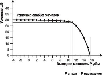 Коэффициент усиления зависит от множества параметров, которые по отдельности или вместе, могут влиять на эффективность усилителя. Коэффициент усиления зависит от длины волны сигнала, состояния поляризации на входе и мощности сигнала. Коэффициент усиления оптического усилителя в значительной степени зависит от уровня входного сигнала. Обычно усилитель хорошо усиливает слабые входные сигналы (например, типичный коэффициент усиления > 30 дБ для предусилителя EDFA достигается при входном сигнале < –20 дБм). Для входных сигналов средней мощности коэффициент усиления начинает отклоняться от прежнего значения. Точка спада на кривой коэффициента усиления является важным параметром усилителя. Она определяется по уровню спада на 3 дБ коэффициента усиления относительно усиления слабых сигналов (см. рисунок П3). Мощность насыщения
