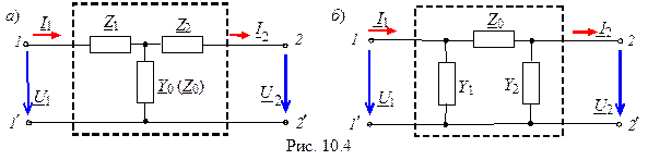 где Примечание. Для симметричного ЧП, у которого Z 1 Х = Z 2 Х и А = D, достаточно провести два опыта: обычно опыт XX и опыт КЗ при прямой передаче. Параметры схем замещения ЧП связаны с коэффициентами уравнений А- формы следующими соотношениями: - для Т -образной схемы замещения (рис. 10.4, а): Y 0 = C; Z 1 = (A - 1) / C; Z 2 = (D - 1)/ C. Обратные соотношения: A = 1 + Z 1 Y 0; B = Z 1 + Z 2 + Z 1 Z 2 Y 0; C = Y 0; D = 1 + Z 2 Y 0. (для симметричного ЧП, у которого А = D, Y 0 = C; Z 1 = Z 2 = (A - 1)/ C );