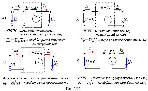 Зависимым (управляемым)называютисточник энергии, ЭДС E либо ток J которого зависит от электрического напряжения или электрического тока в некотором участке цепи. Зависимый источник энергии часто представляют в виде четырёхполюсника, в котором выходная ЭДС Е или выходной ток J управляется входным током I 1 или входным напряжением U 1 (рис.13.1). Различают четыре типа зависимых источников: ИНУН, ИНУТ, ИТУН и ИТУТ. При этом величина выходной ЭДС Е = U 2 либо тока J = I 2 в каждый момент времени определяется мгновенным значением входного управляющего сигнала u 1 либо i 1 и коэффициентом передачи четырёхполюсника К (см. рис. 13.1). Для всех перечисленных зависимых источников энергии выходная величина не влияет на входную, а входная мощность равна нулю, так как или входной ток, или входное напряжение равно нулю. Ниже приведены условные обозначения и свойства зависимых источников энергии из библиотеки источников программной среды MS10: