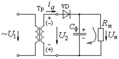 Рис. 2 - Пример выпрямителя с простейшим сглаживающим фильтром Что же получилось? Если подключить осциллограф - это такой прибор, позволяющий наблюдать форму сигналов параллельно нагрузке то увидим следующую картину: