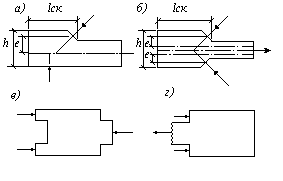 Рис. 5. Врезки в элементах соединений а - несимметричная; б - симметричная; в, г - схемы скалывания в соединениях