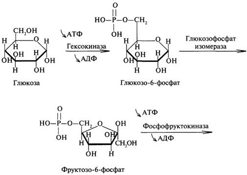 Распад глюкозы возможен двумя путями. Один из них заключается в распаде шестиуглеродной молекулы глюкозы на две трехуглеродные молекулы. Этот путь называется дихотомическим распадом глюкозы. При реализации второго пути происходит потеря молекулой глюкозы одного атома углерода, что приводит к образованию пентозы; этот путь носит название апотомическо-го распада. Дихотомический распад глюкозы может происходить как в анаэробных (без присутствия кислорода), так и в аэробных (в присутствии кислорода) условиях. При распаде глюкозы в анаэробных условиях в результате процесса молочнокислого брожения образуется молочная кислота. Иначе этот процесс называется гликолизом (от греч. glicos - сладкий, lysis - растворение). Отдельные реакции гликолиза катализируют 11 ферментов, образующих цепь, в которой продукт реакции, ускоряемой предшествующим ферментом, является субстратом для последующего. Гликолиз условно можно разбить на два этапа. В первом этапе происходит затрата энергии, второй этап, наоборот, характеризуется накоплением энергии в виде молекул АТФ (схема 1). Первой реакцией гликолиза является фосфорилирование глюкозы с образованием глюкозо-6-фосфата. Глюкозо-6-фосфат далее изомеризуется во фруктозо-6-фосфат, который фосфорилируется до фруктозе-1, 6-дифосфата. Следующей реакцией является лиазное расщепление фруктозо-1, 6-дифосфата до двух триоз-3-фосфоглицеринового альдегида и фосфодиоксиацетона. Образованием этих триоз заканчивается первый этап гликолиза: