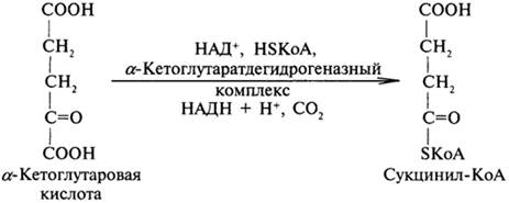 Следующей стадией является окислительное декарбоксилирование α -кетоглутаровой кислоты. Катализируется этот процесс α -кетоглутаратдегидрогеназным комплексом, который аналогичен по структуре и механизму действия пируватдегидрогеназному комплексу. В результате этого процесса образуется сукцинил-КоА: