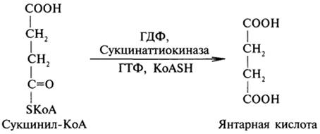 Сукцинил-КоА далее гидролизуется до свободной янтарной кислоты, а выделяющаяся при этом энергия сохраняется путем образования гуанозинтрифосфата (ГТФ). Эта стадия - единственная во всем цикле, в ходе которой прямо выделяется энергия метаболизма:
