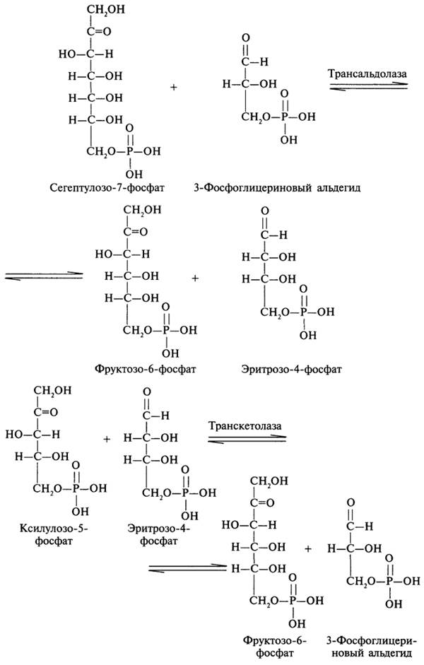Анаэробная фаза анатомического распада глюкозы. Рибулозо-5-фосфат, образовавшийся в окислительной фазе, может обратимо изомеризоваться в другие пентозофосфаты: ксилулозо-5-фосфат и рибозо-5-фосфат. Катализируют эти реакции два разных фермента, относящиеся к классу изомераз: пентозофосфат изомераза и пентозофосфат эпимераза. Образование из рибулозо-5-фосфата двух других пентозофосфатов необходимо для осуществления последующих реакций пентозофосфатного цикла, причем требуется две молекулы ксилулозо-5-фосфата и одна молекула рибозо-5-фосфата.