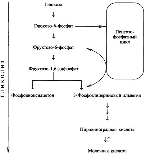 Фруктозо-6-фосфат и 3-фосфоглицериновый альдегид включаются в гликолиз. Оба пути обмена углеводов тесно связаны (схема 3).