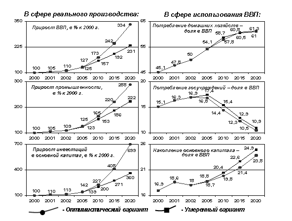 Оптимистический вариант характеризуется (рис.2) ростом валового внутреннего продукта к 2020 году в 3, 3 раза к уровню 2000 года, увеличением объёма инвестиций в основной капитал за рассматриваемый период в 7 раз, высокими мировыми ценами на нефть марки Юралс (до 30 долларов США за баррель в 2020 году) и газ (138 долларов США за 1000 куб. м в 2020 году). При этом среднедушевой объём валового внутреннего продукта к 2020 году в ценах 2000 года достигнет уровня 179, 2 тыс. руб./чел., а доля ТЭК в промышленности России составит 19, 8% против 29, 5% в 2000 году. Указанный вариант основывается на интенсивном проведении экономических реформ и ускоренной либерализации цен и тарифов на продукцию и услуги естественных монополий и предусматривает быстрое создание конкурентной среды на рынке товаров и услуг естественных монополий. Соответственно, этот вариант отличается активным использованием энергосберегающих и энергоэффективных технологий и высокими темпами снижения энергоёмкости. Оптимистический вариант характеризуется благоприятным развитием торгово-экономического и политического сотрудничества с зарубежными партнерами, включая процессы интеграции и вступления во Всемирную торговую организацию при благоприятных для России условиях, решение транзитно-транспортных проблем. Важной составляющей внешних условий развития России является решение проблемы формирования единой энергетической и энерготранспортной инфраструктуры в сопредельных регионах Европы и Азии, развитие международных энерготранспортных систем, недискриминационный транзит энергоносителей.
