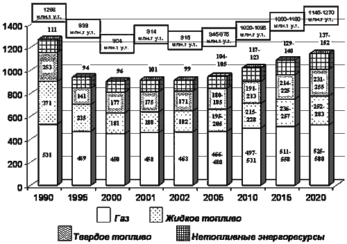 В результате потребность в первичных энергоресурсах на внутреннем рынке России составит к 2010 году 1020 - 1095 млн. т у.т., а к 2020 году – 1145 - 1270 млн. т у.т. (рис.7). Основой внутреннего спроса на топливно-энергетические ресурсы при всех вариантах останется природный газ. При этом его доля в расходной части баланса первичных энергоресурсов снизится с 50% в настоящее время до 45-46% в 2020 году. На жидкое топливо (нефть и нефтепродукты) будет приходиться в течение рассматриваемой перспективы 20-22%, а на твёрдое топливо – 19-20%. Достаточно стабильным будет внутренний спрос и на нетопливные энергоресурсы (электроэнергию и тепло гидро- и атомных электростанций и возобновляемых источников энергии). В предстоящий период наиболее динамично будет расти потребление моторного топлива – на 15-26% к 2010 году и на 33-55% к 2020 году. При этом в качестве моторного топлива впредстоящий период будут также использоваться сжиженный и сжатый природный газ. Прогнозируется также, что в мобильной энергетике к 2020 году начнется распространение электрических и водородных двигателей, а также применение топливных элементов.