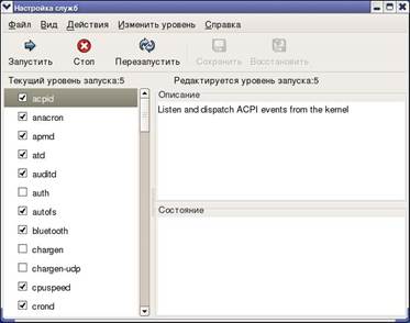 Розглянемо утиліту setup. Запустіть її у вікні терміналу, і перед вами відкриється вікно. Зайдіть в розділ System Services. Тут перераховані всі встановлені сервіси, а напроти тих, що запускаються автоматично, в квадратних дужках стоятиме зірочка. Якщо ви встановлювали який-небудь демон, який вам необхідний в роботі, але використовувати його будете зрідка, то немає необхідності запускати його автоматично і відкривати ворота для хакера. Краще прибрати для нього прапор автозапуска і стартувати тільки при необхідності, а відразу після роботи зупиняти сервіс. Наприклад, при налагоджуванні на сервері Web-сценаріїв, необхідна MySQL. Тримати базу даних постійно завантаженою - марнотратство пам'яті і зайві двері в систему. Тому запускати MySQL необхідно вручну у міру необхідності, і після закінчення налагодження припиняти роботу. Рекомендується діяти так само і прибрати все зайве в чому немає потреби. Для цього стрілками виділіть потрібний демон і зніміть галочку натисненням клавіші пропуск. Після того, як ви збудували автозапуск, перейдіть клавішею < Таb> на пункт ОК, щоб зберегти зміни. Звичайно, вже запущені демони не вивантажаться з пам'яті, але при наступному старті завантажуватися не будуть. Перезавантажте комп'ютер і переконайтеся в тому, що система працює вірно, і запускаються тільки необхідні демони. Якщо ви працюєте в KDE або GNOME, то можна скористатися графічною утилітою для настройки демонів, що автоматично запускаються. Для цього на робочому столі клацніть по значку Control Panel (Панель управління) і перед вами відкриється вікно, що містить посилання на основні програми конфігурування системи. Нас цікавитиме ярлик Служби. Цю ж утиліту можна запустити і іншим способом. Виберіть головне меню ОС, а в ньому пункт Система і, нарешті, Служби (рисунок 1). Надалі, для позначення програм, які потрібно запустити з головного меню, просто писатимемо: Основне меню ОС/Система/Служби Головне вікно графічної утиліти Служби подано на рисунку 2. В центрі форми ви можете побачити список, що складається з двох колонок. В першому стовпці розташовуються прапорці, а в другому - назви демонів. Якщо напроти сервісу стоїть галочка, то служба запускається автоматично. Клацанням по прапорцю ви можете встановлювати і знімати галочку. Виділивши яку-небудь службу, ви можете її запустити, зупинити або перезапустити за допомогою відповідних кнопок на панелі вікна або через меню Дії. Будь-які зміни стану автозавантаження необхідно зберегти. Для цього натискуйте кнопку Зберегтина панелі або виберіть меню Файл/Зберегти зміни. Ніколи не запускайте служби, якими ви не користуєтеся. В автозавантаженні повинні знаходитися тільки ті програми, які необхідні вам або користувачам серверу регулярно.