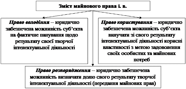 Якщо інтелектуальна власність нематеріальна, то що є об’єктом власності? Об’єктом власності є право на результати інтелектуальної діяльності людини. Це право має подвійну природу. З одного боку, творець (автор) нематеріального об’єкта власності і творець матеріального об’єкта власності мають подібні права власності, тому що право на результат творчої діяльності забезпечує його власнику виняткову можливість розпоряджалися цим результатом на свій розсуд, а також передавати іншим особам, тобто воно подібне до права власності на матеріальні об’єкти (майновим правом). З іншого боку, поряд з майновим правом, існує деяке духовне право творця на результат творчої праці, так зване право автора. Тобто автор має сукупність особистих немайнових прав, що не можуть відчужуватися від їхнього власника в силу їхньої природи, та майнових прав. Іншими словами, якщо майнове (економічне право) на результат творчої праці може бути віддільним від творця (переданим іншій особі в обмежене чи необмежене користування), то немайнове право автора невіддільне від творця і не може бути передано іншій особі. Таким чином, право інтелектуальної власності є сумою тріади майнових прав (права володіти, права користуватися, права розпоряджатися) та немайнових прав (право на авторство, право на недоторканість твору тощо) Отже, поняття права інтелектуальної власності в об’єктивному розумінні – це сукупність правових норм, які регулюють суспільні відносини у процесі створення і використання результатів інтелектуальної, творчої діяльності. В суб’єктивному розумінні – особисті немайнові та майнові права особи на результати інтелектуальної, творчої діяльності, визначені Цивільним кодексом та іншим законом. Особисті немайнові права невіддільно пов’язані з тією людиною, яка створила твір. Така людина має право, щоб його ім’я зазначалося на примірниках твору, який він створив. А якщо автор хоче залишитися невідомим, він може заборонити згадувати своє ім’я під час використання твору. Автор твору має право обрати псевдонім та вимагати зазначення його на творі. Також автор може вимагати, щоб твір залишався без змін – у тому вигляді, як його написав автор. Такі особисті немайнові права зберігаються за автором твору все життя і не можуть бути продані іншим людям. Усі ці права належать людині з того моменту, коли створено твір чи винахід.