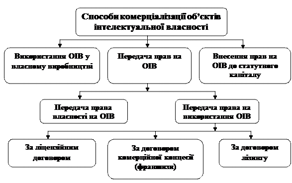 Комерціалізація об’єктів інтелектуальної власності – це взаємовигідні дії всіх учасників процесу перетворення результатів інтелектуальної праці у ринковий товар з метою отримання прибутку чи іншої ринкової вигоди. Метою комерціалізації ОІВ є отримання прибутку за рахунок використання об’єктів права інтелектуальної власності у власному виробництві або продажу чи передачі прав на їх використання іншим юридичним чи фізичним особам. Основними суб’єктами відносин щодо комерціалізації інтелектуальної власності в сучасній ринковій економіці виступають: – автори, творці інтелектуальних продуктів; – трудові колективи, організації, діяльність яких пов’язана зі створенням та використанням об’єктів інтелектуальної власності; – органи державного управління національною інноваційною системою; – інвестори, що фінансують створення та використання об’єктів інтелектуальної власності; – виробники та споживачі інтелектуальної продукції. Основними способами комерціалізації об’єктів права інтелектуальної власності є: – використання об’єктів права інтелектуальної власності у власному виробництві; – внесення прав на об’єкти права інтелектуальної власності до статутного капіталу підприємства; – передача (продаж) прав на об’єкти права інтелектуальної власності. Схематично способи комерціалізації прав на ОІВ представлені на рисунку.
