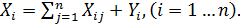 В таблице каждая отрасль упоминается дважды: как производящая – по строкам и как потребляющая – по столбцам. Использованы такие обозначения: i = 1, 2,..., п – производящие отрасли; j =1, 2..., п – потребляющие отрасли; Xi – объем производимой продукции i- й отрасли; Xij – объем продукции i- йотрасли, потребляемой j -й отраслью; Yi – объем конечной продукции i -й отрасли, поступающей непосредственно в потребление. Уровни потребления Yi считаются известными. Они могут быть определены, например, по опыту прошлых лет с учетом тенденции развития. Цель решения задачи – определение объемов продукции в каждой отрасли Xi, исходя из заданных уровней потребления Yi. В соответствии с балансовым принципом производство должно быть равно потреблению, т.е. сумма по каждой строке правой части таблицы (объем потребляемой продукции) должна быть равна значениям левой части таблицы (объем продукции). Тогда на основании табл. 5.1 может быть составлена система балансовых уравнений, описывающая разделение продукции по отраслям: