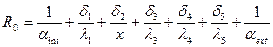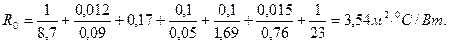 Далее определяем приведенное сопротивление теплопередаче , м2·°С/Вт, заданной многослойной О.К., которое должно быть не менее нормируемого значения , м ·°С/Вт ( ). находим как сумму термических сопротивлений отдельных слоев с учетом сопротивлений теплопередаче внутренней и наружной поверхностей О.К. ( и ) по формуле , которую приведем к нашему частному случаю: