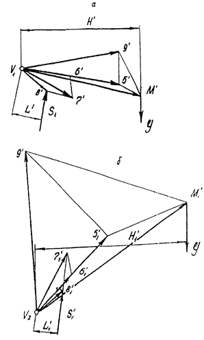 l - відстань від точки 5 до p. Якщо миттєвий центр обертання начіпки плуга на аркуші не розміщується, то значення S1 визначають, користуючись методом M.Є. Жуковського. План швидкостей побудований за межами механізму начіпки (рис. 6, а). Швидкість точки 5 в довільному масштабі зображена відрізком V1-5¢ (вектор швидкості проведений із полюса V1 паралельно ланці 1-5). Потім із полюса плана швидкостей проведена лінія V1 -9¢, що паралельна ланці 2-9, а із точки 5΄ лінія 5΄ -9΄, що паралельна 5-9. Точка 9΄ перетинання цих ліній визначає кінець вектора швидкості точки 9 механізму начіпки. На відрізку 5΄ -9΄ побудований трикутник, подібний трикутнику 5-9-M. Вектор V1 M є не що інше, як швидкість центра тяжіння плуга. Вектор швидкості точки 6 буде менше вектора швидкості точки 5 в стільки разів, в скільки разів ланка 1-6 менша ланки 1-5. Швидкість точки 7: