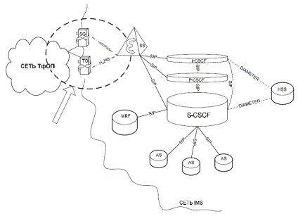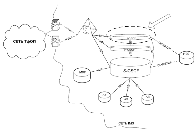 Рис. 16 Архитектура IMS. Стык сети ТфОП и IMS Во избежание путаницы, на рис. 16 отмечены только те логические связи между элементами, которые имеют значение и/или учитываются при расчетах в курсовом проекте. На линиях, указан протокол, при помощи которого осуществляется взаимодействие между функциональными объектами. Выделенный пунктиром фрагмент представляет собой схему из разд. 2. Основной задачей функционального элемента MGCF/Softswitch является управление транспортными шлюзами на границе с сетью ТфОП. В разд. 2 уже был произведен расчет этого оборудования, поэтому будем пользоваться результатами, полученными ранее. Ссылки на уже рассчитанные величины, которые потребуются для дальнейших расчетов, будут приведены по ходу проектирования. 3.4. Расчет необходимого транспортного ресурса, необходимого для обеспечения сигнального обмена с функцией S-CSCF Попадая в сеть IMS, вызовы в конечном итоге обслуживаются одной из S-CSCF. Этот сетевой элемент представляет собой SIP-сервер, управляющий сеансом связи. Для выполнения своих функций он получает от других сетевых элементов всю информацию об устанавливаемом соединении и требуемой услуге (рис. 17).