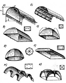 Пространственные покрытия от плоскостных отличаются тем, что тонкая плита оболочки работает преимущественно на сжатие, а растягивающие усилия рационально сосредоточены в контурных элементах, причем все эти элементы работают в разных плоскостях. Основными видами пространственных покрытий являются: свод, оболочки одинарной и двоякой кривизны, гипары. Свод — в архитектуре тип перекрытия или покрытия сооружений, конструкция, которая образуется выпуклой криволинейной поверхностью.
