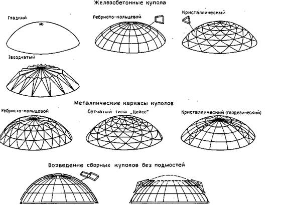 Для обеспечения пространственной жесткости купола в двух и более секторах устанавливают связи по наружным поясам ребер. Система связей и прогонов вместе обеспечивает общую устойчивость купольной системы. Размеры высоты купола и его отношения к диаметру назначаются исходя из архитектурных и композиционных требований. Очертание купола принимается круговым, но иногда центр окружности смещают с центральной оси. Такие купола по своей форме называют тороидальными. Для покрытия большепролетных конструкций часто применяют эллиптическое очертание купола. Наиболее выгодными по конструктивной схеме считаются ребристо-кольцевые купола. Такие купола представляют собой соединенные меридиональные ребра при помощи колец. Но такой вид куполов очень сложен с точки зрения проектирования и монтажа. Монтаж купольных покрытий осуществляется с использованием стационарных или передвижных опор в виде башен или мачт. Обычно используется только одна центральная опора, на которой закрепляют верхнее кольцо. Полуарки предварительно монтируются на земле и устанавливаются попарно друг напротив друга, опирая их верхнее и нижнее кольцо. После завершения монтажа каркаса купола башня убирается. При монтаже сетчатых куполов применяются сплошные леса. Конструкции куполов могут быть гладкими, ребристыми, ребристо-кольцевыми, кристаллическими, звездчатыми и т. д. При проектировании купольных покрытий необходимо обращать внимание на создание благоприятных акустических условий, так как в залах с купольным покрытием создается концентрация отраженного звука, что вынуждает принимать дополнительные меры по звукопоглощению. Купольное покрытие состоит из оболочки купола, опорного кольца, а иногда и верхнего кольца, если вверху купола имеется центральный проем.