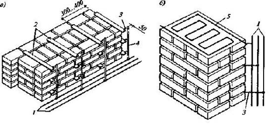 Схемы электропрогрева кладки: а - кирпичной стены, б -кирпичного столба; 1 - электрическая сеть; 2 -пластинчатые электроды; 3 - отпайки; 4 -провода; 5 - стальная сетка Электропрогрев кладки продолжают до набора раствором прочности не менее 20% марочной прочности. Армирование кладки с расположением сеток через 1...4 ряда и прутков в сетке через 5...7 см, с заведением сеток в примыкания и сопряжения повышает прочность кладки после оттаивания в 2 раза. Кладку в тепляках, изолированных от наружного воздуха объемах, в которых при помощи подогретого воздуха создается температура выше +10°С, выполняют редко, обычно для отдельных, изолированных участков кладки.