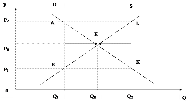 QE = QS = QD, где QE – равновесный объем; QS – объем предложения; QD – объем спроса.