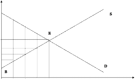 Рис. 3.8. Равновесие по А. Маршалу Рассмотрим теперь результаты свободного рыночного обмена на основе равновесных цен с точки зрения общественной выгоды, получаемой покупателями и продавцами. Мерой такой выгоды служат понятия излишка потребителя и излишка производителя.