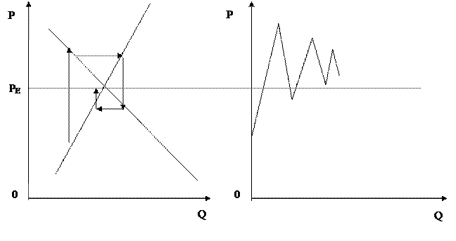 Рис. 3.11. Динамика спроса и предложения Эти правила действуют при изменениях спроса и предложения, то есть под действием неценовых факторов (сдвиг кривых спроса и предложения вправо или влево). Рассмотрим, насколько рыночное равновесие может быть устойчивым, стабильным. Под стабильностью равновесия понимается способность рынка, выведенного из равновесного состояния, вновь возвращаться к нему под влиянием своих внутренних сил. Для иллюстрации этого используется модель паутины. Равновесие в паутинной модели зависит от углов наклона спроса и предложения. Здесь возможны 3 случая: 1) неустойчивое равновесие, или расходящаяся паутина, когда реакция предложения на изменение цены не приводит рынок к равновесному состоянию (угол наклона кривой спроса круче угла наклона кривой предложения). В этом случае колебания носят взрывной характер и равновесие не наступает;