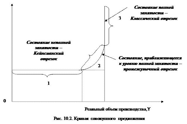 Изменение курса валюты страны по отношению к валютам других стран являются фактором, который оказывает влияние на чистый экспорт, и, следовательно, на совокупный спрос. 10.1.2. Совокупное предложение. Неценовые факторы совокупного предложения Совокупное предложение – то количество товара и услуг, то есть реального ВНП, которое национальные производители захотят и в состоянии будут предложить по любому из возможных уровней цен. Зависимость между уровнем цен и объемом предлагаемого национального продукта является прямой, или положительной. Для анализа кривой совокупного предложения следует выделить краткосрочный и долгосрочный периоды. Краткосрочный период в макроэкономике – период, в течение которого цены неизменны. Долгосрочный период представляет собой период, в течение которого цены гибкие. Три сегмента кривой совокупного предложения определяются как: - кейнсианский (горизонтальный); - промежуточный (отклоняющийся вверх); - классический (вертикальный).