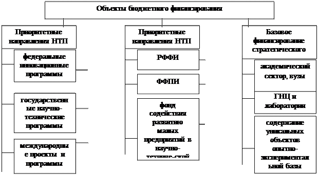 Необходимым условием повышения инновационной активности в стране, перехода на преимущественно инновационный путь развития экономики выступает эффективное финансовое обеспечение инновационных процессов. Система финансирования инновационной деятельности в России пережила несколько эволюционных этапов, переходя от применения в основном бюджетного финансирования к преимущественному использованию собственных средств предприятий и организаций для инновационных целей. В связи с ограниченностью собственных средств, падением платежеспособного спроса на инновации особую актуальность получает задача формирования многоисточниковой системы финансирования инноваций. К принципам создания такой системы отнесём охват финансированием всех стадий инновационного цикла, гибкость и динамичность форм и источников финансирования, целевой, адресный и конкурсный характер финансирования, эффективность финансирования. Средства, используемые для финансирования инноваций, различаются по видам собственности, степени централизации, по уровням и формам финансирования. По видам собственности различают: - государственные инвестиционные ресурсы (бюджетные средства, средства внебюджетных фондов, государственные заимствования, имущество в государственной собственности); - инвестиционные ресурсы хозяйствующих субъектов, а также общественных организаций, физических лиц. На уровне государства и субъектов Федерации источниками финансирования являются: - собственные средства бюджетов и внебюджетных фондов; - привлечённые средства государственной кредитно-банковской и страховой сфер; - заёмные средства (международные заимствования и внутренний долг государства). На уровне предприятия к источникам финансирования можно отнести: - собственные средства (уставный капитал, прибыль на накопление, амортизационный фонд, страховые возмещения, иммобилизованные ресурсы); - привлеченные средства, полученные от продажи акций, партнёрский капитал; - заёмные средства (бюджетный, банковский, товарный кредиты на различной основе). Бюджетные ассигнования на разработку и реализацию инноваций ограничены бюджетными доходами, зависят от политико-экономических условий. В технологически развитых странах размеры бюджетных средств на научно-техническое развитие достаточно велики, объекты инвестирования определяются на конкурсной основе с учётом национальной инновационной стратегии и оборонной доктрины. Например, в Японии на уровне Конституции введено ограничение: не менее 3% валового национального дохода из бюджета должно направляться на развитие фундаментальных научных исследований [31, с. 180]. Примерно в таких же пропорциях осуществляется финансирование. В бывшем СССР в конце 80-х годов прошлого века расходы на НИОКР составляли примерно 5 % национального дохода. В настоящее время эти расходы в реальном исчислении сократились примерно в 7 раз и составляют чуть более 1 % ВВП России. При этом в общей сумме расходов на инновации доля бюджетных источников не превышает 5 %. Объекты бюджетного финансирования инновационной деятельности представлены на рис. 4.1.