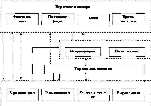 Большинство структур венчурного капитала представляют собой независимые фонды, объединяющие капиталы финансовых институтов. Однако некоторые финансовые институты имеют свои собственные фонды венчурного капитала («подчиненные фонды»), а в некоторых странах существует неформальный рынок венчурного капитала частных лиц («деловые ангелы») и больших компаний («корпоративное венчурное инвестирование»). Индустрия венчурного капитала хорошо развита в Соединенных Штатах, где она ориентирована на новые технологии и включает различные типы инвесторов, таких как пенсионные фонды, страховые компании и частные лица. Европейская индустрия венчурного капитала моложе, ориентирована на основные секторы рынка, и в ней доминируют банки. Японские фирмы венчурного капитала в основном являются дочерними фирмами финансовых институтов, которые делают инвестиции в надежные фирмы и, в основном, предоставляют кредиты. Венчурный капитал является критическим фактором в инновационном процессе. В силу различных причин большим компаниям трудно осуществлять связанные с высоким риском инновационные проекты. Такие проекты имеют максимальные шансы на успех, если они выполняются в малых технологических фирмах. Венчурные капиталисты хотят и в состоянии инвестировать в такие сопряженные с высоким риском проекты, используя свои финансовые инструменты. Это подтверждается тем фактом, что технологические революции, приведшие к трансформации целых отраслей промышленности, возглавлялись фирмами, поддержанными венчурным капиталом. Например, были профинансированы венчурным капиталом фирмы, шедшие впереди каждого нового поколения компьютерных технологий (персональные компьютеры, программное обеспечение и т.д.). По своей стоимостной оценке рынок венчурного капитала мал по сравнению с другими финансовыми рынками даже в Соединенных Штатах. Однако из-за того, что венчурные капиталисты специализируются на инвестировании в быстро растущие компании, их экономическая роль весьма значительна. Например, факты указывают на то, что в Соединенных Штатах пользующиеся поддержкой венчурного капитала компании растут быстрее, чем 500 крупнейших промышленных компаний США, и имеют более высокие расходы на НИОКР в расчете на одного работающего. В большинстве случаев венчурные капиталисты не стремятся взять контроль над финансируемыми предприятиями в свои руки. Если решение об инвестировании принято, венчурный капиталист будет стремиться всячески поддерживать руководство фирмы, чтобы предприятие добилось успеха и вложенные средства вернулись с прибылью. Обычно венчурные капиталисты входят в состав совета директоров, решение же текущих вопросов осуществляет именно руководство предприятия, а венчурный капиталист поддерживает его своими деньгами, финансовым опытом и знаниями в области планирования и других сферах. Так как деньги обычно предоставляются на длительный срок (на 5 лет и более), очень важно, чтобы между предпринимателем и венчурным капиталистом установилось взаимное доверие и понимание. При выборе инвестиционных проектов венчурный капиталист применяет три основных критерия. Прежде всего, компания должна иметь сильное руководство. Лица в управленческой команде должны обладать солидным опытом и хорошей подготовкой, они должны быть преданы 