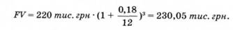 де: МВ – нарощена сума кредиту, тобто сума кредиту разом з нарахованими відсотками; СК – початкова сума кредиту; К – річних відсоткова ставка; n – кількість років; m – кількість разів нарахування складного відсотка протягом року. Приклад Банк надав підприємству кредит у сумі 220 тис. грн. строком на 3 міс. під 18 % річних. Розрахувати суму заборгованості підприємства перед банком за умови щомісячного нарахування складних відсотків. Сума заборгованості позичальника перед банком на момент погашення кредиту становитиме