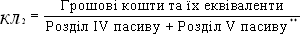 * Витрати майбутніх періодів включаються до складу поточних активів у тій частині, яка буде використана (списана) протягом 12 місяців з дати балансу. ** Доходи майбутніх періодів включаються до складу поточних зобов’язань у тій частині, яка буде погашена протягом 12 місяців з дати балансу. Ця інформація зазначається у Примітках до фінансової звітності. Нормативне значення КЛ1 не менше 2, 0 – 2, 5. Тобто, підприємство повинно мати 2 – 2, 5 гривні ліквідних активів на гривню короткотермінових зобов’язань. Коефіцієнт абсолютної (термінової) ліквідності (КЛ2), який показує, яка частина поточних (короткострокових) зобов’язань може бути погашена негайно: