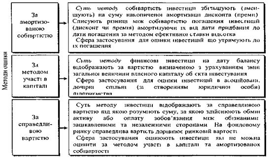 Вартість фінансових iнвестицiй, більше ніж будь-яких інших активів підприємства, може зазнавати змін. У зв’язку з цим, для забезпечення достовiрностi iнформацiї, наведеної у фiнансовiй звiтностi, необхідно здійснювати оцінку фінансових iнвестицiй. Відповідно до Міжнародних стандартів бухгалтерського обліку, оцінка – це процес визначення грошових сум, за якими повинні визнаватися і відбиватися елементи фінансових інвестицій у балансі та звіті про прибутки і збитки. У фінансових звітах використовуються в різних комбінаціях кілька різних методів оцінки, що визначені національними П(С)БО 12 “Фінансові інвестиції”. Вибір методів оцінки залежить від видів фінансових інвестицій, тобто чи це поточні чи довгострокові фінансові інвестиції. Первісна оцінка та відображення в бухгалтерському обліку фінансових інвестицій здійснюються за собівартістю, яка складається з ціни придбання, комісійних винагород, мита, податків, зборів, обов’язкових платежів та інших витрат, безпосередньо пов’язаних з придбанням фінансової інвестиції. Для відображення на дату балансу запроваджуються фактично три методи оцінки фінансових інвестицій: за справедливою вартістю; за амортизованою собівартістю фінансових інвестицій; за методом участі в капіталі. Вони застосовуються залежно від того, в який об’єкт здійснено інвестиції. У зв’язку з цим розрізняються такі об’єкти інвестування: 1. фінансові інвестиції, що придбані та утримуються виключно для продажу, обліковуються за справедливою вартістю; 2. фінансові інвестиції, що утримуються підприємством до їх погашення, обліковуються за амортизованою собівартістю фінансових інвестицій; 3. фінансові інвестиції в асоційовані і дочірні підприємства та в спільну діяльність зі створенням юридичної особи (спільного підприємства), обліковуються за методом участі в капіталі.