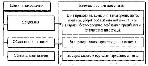 Первісну вартість придбаної фінансової інвестиції встановлюють за її собівартістю, що об'єднує усі витрати, пов'язані з їх придбанням, виплату комісійних винагород та гонорарів, сплату мита, податків тощо): Фін = Цфі + Кв+ М + ПЗП + ОП + ВІ, де Фін – первісна вартість (собівартість) фінансової інвестиції, Цфі – ціна придбання фінансової інвестиції, Кв – комісійні винагороди, М – мито, Пзп – податки і збори, Оп – обов’язкові платежі, Ві – інші витрати, безпосередньо пов’язані з придбанням фінансової інвестиції. Якщо фінансова інвестиція придбана шляхом обміну на цінні папери власної емісії, то первісну вартість такої інвестиції визначають за справедливою (ринковою) вартістю переданих цінних паперів. У випадку придбання фінансової інвестиції шляхом обміну на інші активи первісну вартість (собівартість) визначають за справедливою вартістю цих активів.