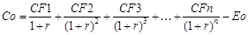 де Со – вартість інвестиції; CF – чистий грошовий потік (Сash-flow) від здійснення інвестиції; Ео – собівартість інвестиції; r – коефіцієнт, який характеризує ставку дисконтування (r = p /100 %); p – ставка дисконтування (ставка дохідності за найкращою (або середньою) з альтернативних можливостей вкладення коштів на ринку); складається з двох компонентів: фіксованої ставки за безризиковими вкладеннями та середньоринкової премії за ризик; n – період, протягом якого кошти вкладаються у фінансові інвестиції (кількість інтервалів, за які нараховуються доходи). Якщо керуватися критерієм прибутковості, рішення щодо інвестиційних вкладень може бути прийняте, якщо вартість інвестиції є не менше нуля (Со > 0). У такому разі рентабельність фінансових інвестицій дорівнюватиме або перевищуватиме ставку рентабельності за альтернативними вкладеннями на ринку. У разі наявності багатьох альтернативних вкладень перевага віддається тому фінансовому інструменту, вартість якого є найвищою. 2. метод внутрішньої норми прибутковості. При оцінці інвестицій даний метод передбачає розрахунок відносного показника – ставки дохідності, за якої вартість інвестиції дорівнює нулю (теперішня вартість усіх грошових видатків на здійснення інвестиції дорівнює теперішній вартості всіх грошових надходжень від цієї інвестиції). Ця ставка відповідає мінімальній ставці рентабельності, за якої пріоритет може надаватися альтернативним вкладенням на ринку. Правило прийняття інвестиційних рішень за цим методом формулюється таким чином: перевага повинна віддаватися тому об’єкту інвестицій, внутрішня норма прибутковості за яким є більшою, ніж середня ставка дохідності за альтернативними вкладеннями на ринку капіталів. Для розрахунку внутрішньої норми прибутковості у формулі Cо – підставимо нуль, re – коефіцієнт, який характеризує внутрішню ставку дохідності, оскільки саме за нульової внутрішньої вартості інвестицій їх норма дохідності дорівнює середній ставці дохідності за альтернативними вкладеннями. Методом передбачено, що шукану процентну ставку можна розрахувати на основі зіставлення вартості інвестицій за двох пробних варіантів ставок дисконтування (re 1; re 2), які підбираються таким чином, що в інтервалі між re 1 та re 2 вартість інвестиції змінює своє значення з “+” на “–“, і навпаки. Отримаємо алгоритм, який рекомендується використовувати для розрахунку внутрішньої норми прибутковості: