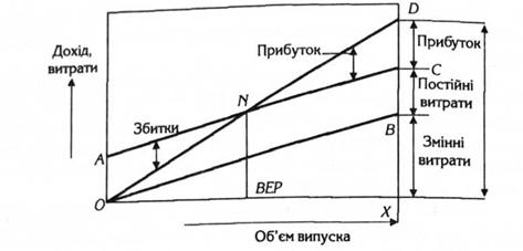 Цей графік показує обсяг проведеної продукції в натуральному виразі на горизонтальній осі і величину доходу або витрат у вартісному виразі на вертикальній осі. Можна було б побудувати аналогічний графік, відкладаючи по горизонтальній осі об'єм випуску у відсотках до повної потужності. Лінія АВ, що показує постійні витрати, які не міняються залежно від об'єму, проходить паралельно осі X. Вертикальна відстань між лінією АВ і лінією АС, при будь-якому певному об'ємі, характеризує сукупні змінні витрати виробництва даного об'єму продукції, а вертикальна відстань між OA і АС, при будь-якому певному об'ємі виробництва, характеризує сукупні витрати виробництва даного об'єму. Коли продукція не реалізується, сукупні витрати не рівні нулю, а рівні OA. Коли об'єм випуску рівний X, сукупні витрати представлені лінією СХ, яка рівна = ХВ + ВС (ХВ – фіксовані елементи витрат (те ж, що OA) і ВС – змінні елементи витрат). Для кожної конкретної ціни продажу одиниці кінцевого продукту лінія OD показуватиме величину доходів при різних обсягах продажу. Перетин лінії сукупного доходу з лінією сукупних витрат визначає точку беззбитковості (ВЕР) “N”, точку, в якій сукупний дохід рівний сукупним витратам (змінним і постійним). Будь-яка різниця по вертикалі між лінією сукупного доходу і сукупних витрат праворуч від ВЕР показує прибуток при даному обсязі виробництва, тоді як збитки показуватимуться на графіку зліва від ВЕР, оскільки як в цьому випадку сукупні витрати перевищують сукупний дохід. Існує ще один спосіб графічного представлення аналізу беззбитковості, який носить назву “зворотного графіка беззбитковості”. На перший погляд може здатися, що він відрізняється від того, який ми розглянули вище, хоча в основі своїй вони абсолютно однакові.
