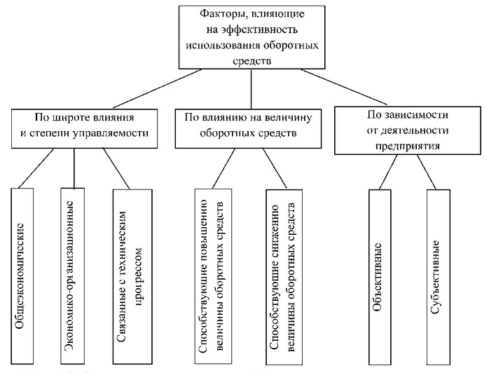 Рисунок 1 – факторы, влияющие на эффективность использования оборотных средств. Эффективность использования оборотных средств характеризуется системой экономических показателей, и самое главное это оборачиваемостью оборотных средств[1, 116]. Оборачиваемость оборотных средств – это продолжительность полного кругооборота средств с момента приобретения оборотных средств, до реализации и выхода определенной готовой продукции[14, 87]. Этот кругооборот средств заканчивается зачисление выручки на счет предприятия. На различных предприятиях оборачиваемость оборотных средств неодинакова и зависит от их отраслевой принадлежности, а в пределах одной отрасли – от организации производства и сбыта продукции, размещение оборотных средств и других факторов. Оборачиваемость оборотных средств зависит от таких показателей как: количество оборотов за определенный период времени, длительностью одного оборота, суммой занятых на предприятии оборотных средств на единицу продукции(коэффициент загрузки). Длительность одного оборота рассчитывается по формуле: О= С: (Т/Д), (3) Где О – длительность оборота, дни; С – остатки оборотных средств, руб.; Т – объем товарной продукции, руб.; Д – число дней в рассматриваемом периоде, дни[14, 88]. Уменьшение длительности этого оборота говорит об уменьшении использования оборотных средств. Коэффициент оборачиваемости оборотных средств(К0), или количество оборотов за определенный период – характеризует количество оборотов оборотных средств за рассматриваемый период, определяя объем реализованной продукции, на 1 руб. оборотных средств[1, 117], рассчитывается так: К0 = Т/С. (4) И чем выше этот коэффициент, тем эффективнее используются оборотные средства. Коэффициент загрузки оборотных средств (Кз) – обратный коэффициенту оборачиваемости, он показывает сумму оборотных средств, затраченных на 1 руб. реализованной продукции[1, 118], рассчитывается следующим образом: Кз = С/Т. (5) Помимо перечисленных показателей также может использоваться показатель отдачи оборотных средств, он определяется отношением прибыли от реализации продукции предприятия к остаткам оборотных средств. Ускоряя оборачиваемость оборотных средств, из оборота высвобождаются материальные ресурсы и источники их образования, при замедлении - в оборот вовлекаются дополнительные средства. Высвобожденные оборотные средства вследствие ускорения их оборачиваемости может быть относительным и абсолютным. Абсолютное высвобождение – определяется арифметической разницей между фактической и плановой стоимостью. Оно не учитывает изменений в объемах реализуемой продукции[1, 118]. Относительное высвобождение оборотных средств (Э отн) имеет место в тех случаях, когда ускорение их оборачиваемости происходит одновременно с ростом объема выпуска продукции, причем темпы роста производства опережает темп роста остатков оборотных средств[14, 89]. Рассчитывается по формуле: