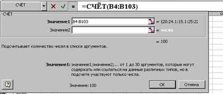 За допомогою функції “СЧЕТ”, наприклад у комірці D10, обчислимо обсяг сукупності (рис. 1.6).