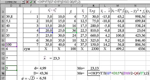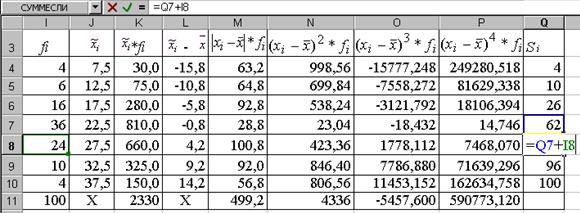 Для обчислення моди та медіани необхідно спочатку знайти модальний та медіанний інтервали побудованого і. в. р. Очевидно, що модальним є 4-й інтервал, оскільки його частота f 4=36 найбільша. Для знаходження медіанного інтервалу необхідно для кожного і- го Аналізуючи значення Si, легко встановити, що медіанним інтервалом є 4-й інтервал, оскільки він перший з інтервалів, для яких накопичена частота перевищує половину обсягу сукупності: Після знаходження модального та медіанного інтервалів обчислюємо моду та медіану за відповідними формулами