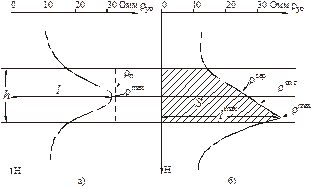 де: Гпар – значення геофізичного параметру пласта; l – відхилення кривої від лінії відліку в см; M – горизонтальний масштаб реєстрації геофізичного параметра (наприклад, 1 Ом·м/см). Для кривих геофізичних параметрів, які мають симетричний характер, відхилення кривої (l) береться напроти середини пласта (Рис. 6.1, а). Для градієнт зондів, враховуючи несиметричний характер кривої, напроти пласта можемо мати різне значення геофізичного параметру (уявного опору): r max – максимальне; r min – мінімальне; r опт – оптимальне; r сер – середнє. В залежності від співвідношення товщини пласта (h) до розміру зонда (Lз) – h/L з слід визначати r уо таким чином:
