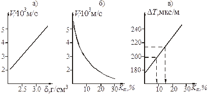 Рисунок 7.6 – Залежність V від d (а) та K п (б) і D T від K п (в) Зв’язок між швидкістю пружних хвиль, інтервальним часом і коефіцієнтом пористості представлений наступними формулами: