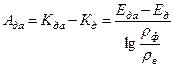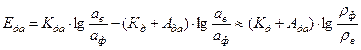 де K дa= K д+ A дa – коефіцієнт дифузійно-адсорбційної електрорушійної сили; A дa – дифузійно-адсорбційна активність породи. Величина А дa і E дa визначаються хімічним складом і концентрацією контактуючих розчинів, речовинним і гранулометричним складом породи, густиною укладання частинок і мірою водонасичення (нафтогазонасичення) колектора, температурою та тиском в свердловині. Дифузійно-адсорбційна активність розраховується за формулою: