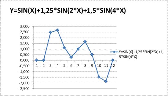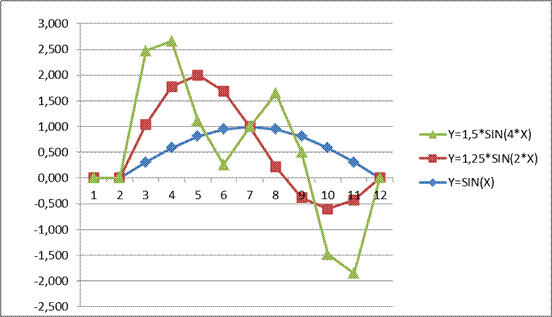 2. Добавление формул в существующую таблицу подстановки с одной переменной. 2.1.Пользуясь инструментом " таблицы подстановки", создала аналогично упражнению п.п.1.1 - 1.3 таблицу, позволяющую рассчитать 11 значений функции Y=SIN(X) при Х, меняющемся от 0 до 3, 1415926. Эта таблица представлена на рис.П.18.2 в ячейках В7: С18. 2.2.Дополнила таблицу тремя новыми формулами: Y=1, 25*SIN(2*X), Y=1, 5*SIN(4*X), Y=SIN(X)+1, 25*SIN(2*X)+1, 5*SIN(4*X), зависящими от одного и того же аргумента Х, меняющегося в том же диапазоне значений. 2.3. Построила два графика, на первом из которых представлены три первые функции: Y=SIN(X), Y=1, 25*SIN(2*X), Y=1, 5*SIN(4*X), а на втором – четвертая функция Y=SIN(X)+1, 25*SIN(2*X)+1, 5*SIN(4*X).