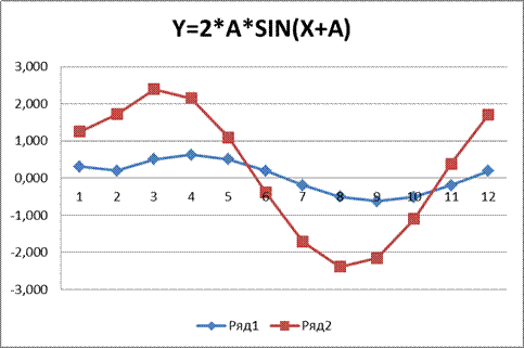 Рис.П.18.3 3.2.Пользуясь " таблицей подстановки" с двумя переменными А и Х, создала таблицу для вычисления функции Y=2*A*SIN(X+A). Диапазоны изменения А и Х. 3.3.Выполнила вычисления, проверила правильность результатов и построила графики для Y=2*A*SIN(X+A) при трех значениях А аналогично тому, как показано на рис.П.18.4.