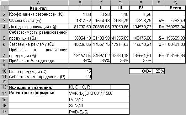 Рис.П.18.10 1.2.Задала в качестве целевой ячейку, содержащую величину годовой прибыли (P). 1.3.В результате поиска достигается значение цели (прибыли) или ее экстремальное (максимальное или минимальное) значение. 1.4.Последовательно добавила в список выражения, ограничивающие условия поиска. В качестве таких выражений задала следующие ограничения: · затраты на рекламу в каждом квартале (Qi) не могут быть отрицательными; · цена продукции не должна быть меньше себестоимости. 1.6.Выполнила поиск решения. В результате решение найдено и результаты поиска совпадают с результатами, приведенными на рис.П.18.11.