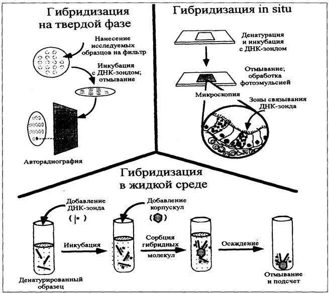 Рис. 1. Выявление генетических маркеров в реакции гибридизации нуклеиновых кислот. Для простоты показаны лишь тесты с радиоактивномеченым ДНК-зондом; возможность других меток предполагается (см. текст). В фильтрационном тесте образцы ДНК денатурируют и наносят на мембрану. После инкубации с ДНК-зондом положительные образцы выявляют путем авторадиографии. При гибридизации in situ манипуляции с ДНК проводят в интактных образцах ткани, фиксируемых на предметном стекле. После инкубации с ДНК-зондом на стекло наносят фотографическую эмульсию. В зонах радиоактивной эмиссиии (т.е. там, где произошла гибридизация) на ней проявляются темные микроскопические гранулы. При гибридизации в растворе смесь ДНК-зонда и денатурированного образца инкубируют в жидкой среде. После гибридизации двухспиральные молекулы-гибриды осаждают из раствора на специальных корпускулах и отмывают от несвязанного ДНК-зонда. Присутствие в пробе ДНК-фрагмента с искомой последовательностью выявляют по радиоактивности осадка [Schaechter M., Medoff G., Eisenstein B.I. (eds.). Mechanisms of Microbial Disease. Williams & Wilkins, 1993]