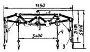 | Траверса универсальная в комплекте с автоматическими захватами: 1-траверса; 2-лебедка; 3-захваты; 4-стропы.