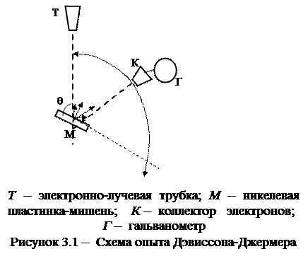 Основные понятия по теме В начале 20-го века для частиц вещества был обнаружен ряд эффектов, внешне сходных с оптическими явлениями, характерными для волн. Так, в 1921 году Рамзауэр при исследовании рассеяния электронов на атомах аргона обнаружил, что эффективное сечение упругого рассеяния электронов на аргоне при энергии электрона E ~ 1 эВ становится близким к нулю. Впечатление такое, что при E ~ 1 эВ электроны не испытывают с атомами аргона столкновений и пролетают через газ без рассеяния. Этот эффект аналогичен образованию пятна Пуассона при дифракции света на малом экране. В 1927 году американскими физиками Дэвиссоном и Джермером, а также независимо от них английским физиком Дж. П. Томсоном установлено, что моноэнергетические электроны, падающие параллельным пучком из электронно-лучевой трубки T на никелевую пластинку M (рисунок 3.1), после взаимодействия с ней распределялись в пространстве аналогично тому, как распределено рентгеновское излучение после дифракции на кристалле.