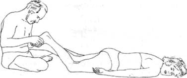 Подхватите левой рукой ногу партнера, взявшись за тыльную (поверхностную) часть стопы, а кулак правой руки поместите на ее подошву. Осторожно растирайте подошву, продвигаясь по ней вверх и вниз. Можно растирать ее суставом большого пальца правой руки, если партнер захочет этого. Продолжая удерживать ногу партнера левой рукой, пальцами правой разотрите каждый палец его ноги. Далее приподнимите ногу партнера так, чтобы он при-согнул колено. Левая рука удерживает пятку, чтобы она оставалась неподвижной, а ладонь вашей правой руки достаточно энергично надавливает на выемку свода стопы партнера. Теперь подхватите обеими руками стопу партнера снизу. Аккуратно тяните ее вниз, нажимая на тыльную сторону стопы и разводя пальцы ноги в стороны большими пальцами рук. Проделайте всю процедуру с другой ногой партнера. ' Когда закончите, поместите кисти на подошвы ног партнера и оставайтесь некоторое время в контакте (около минуты). • После того как уберете руки со стоп партнера, у него должно остаться ощущение, что ваши руки все еще остаются в контакте с его стопами. Произошло ли это?