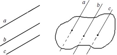 Рис.3 Приведем несколько примеров параллельных прямых. 1. Противоположные края тетрадного листа лежат на прямых. 2. Прямые, по которым плоскость стены дома пересекает плоскости потолка и пола, являются параллельными. 3. Железнодорожные рельсы на ровной местности также можно рассматривать как параллельные прямых.