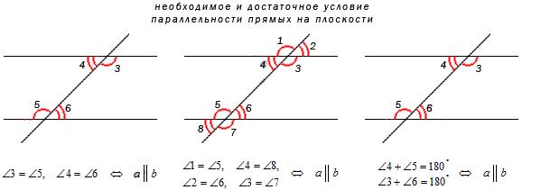 Рис.7 Теорема 2.3. Если две прямые на плоскости пересечены секущей, то для их параллельности необходимо и достаточно, чтобы накрест лежащие углы были равны, или соответственные углы были равны, или сумма односторонних углов равнялась 180 градусам. Покажем графическую иллюстрацию этого необходимого и достаточного условия параллельности прямых на плоскости (рис.8)